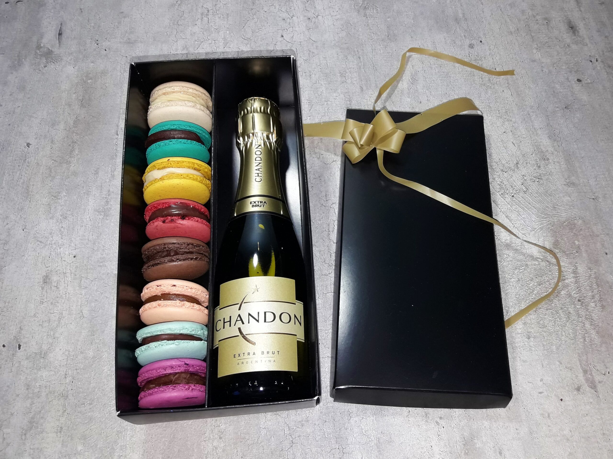 Sobria caja negra conteniendo 8 macarons surtidos y una botella de champagne 187ml.