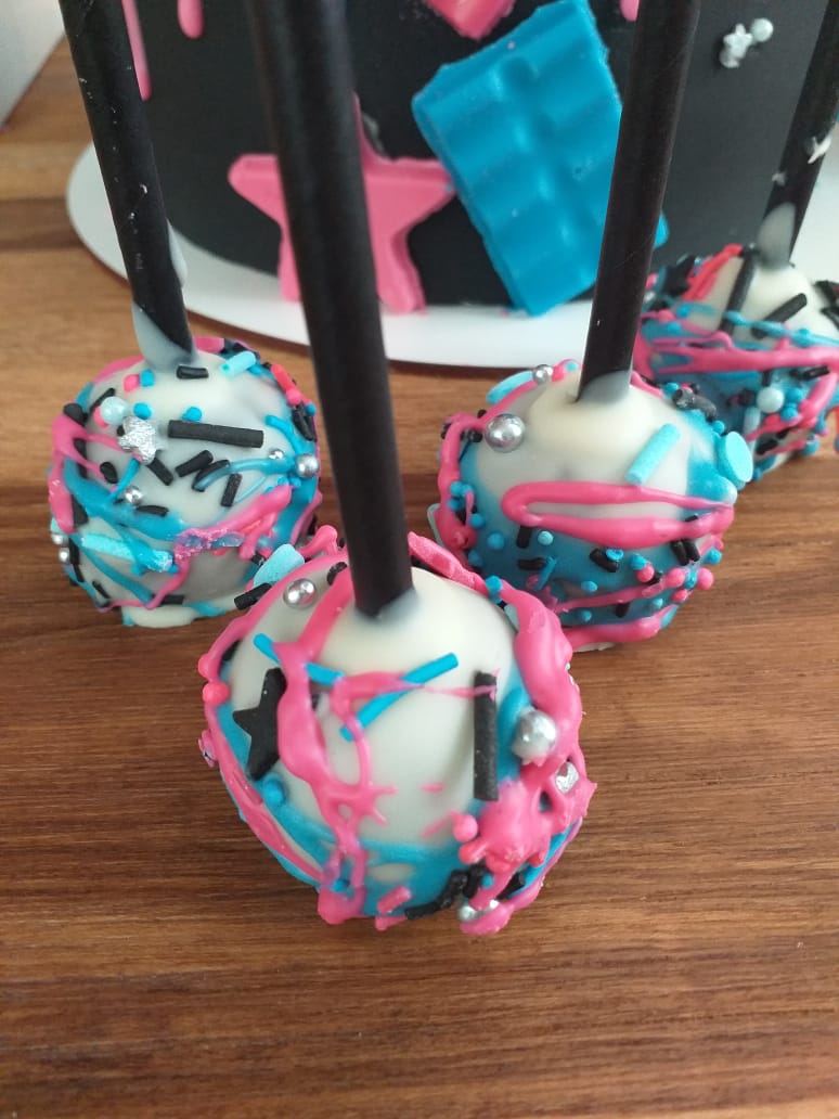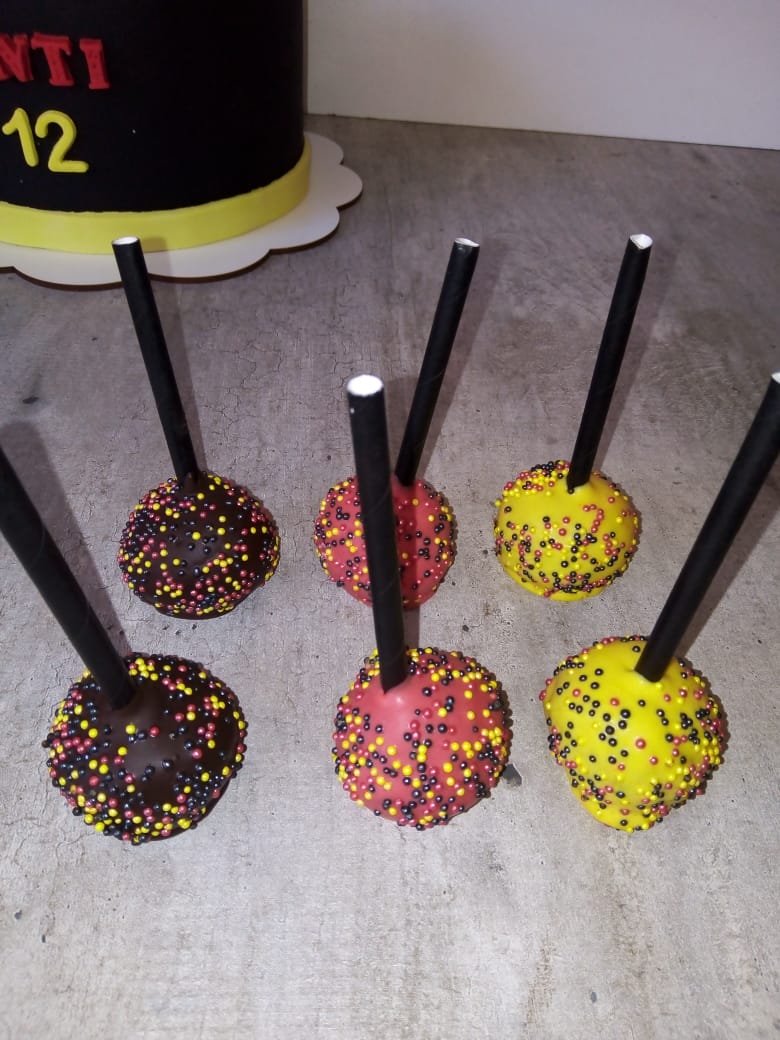 Cake pops, trufa de chocolate bañadas con chocolate y decoradas según la temática que elijas.