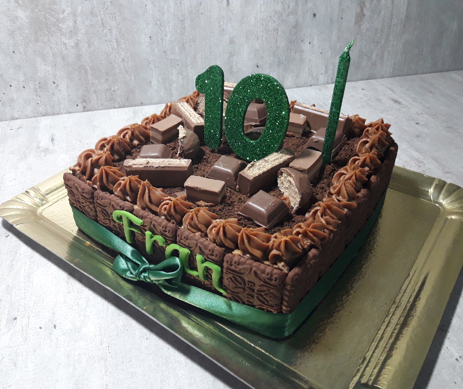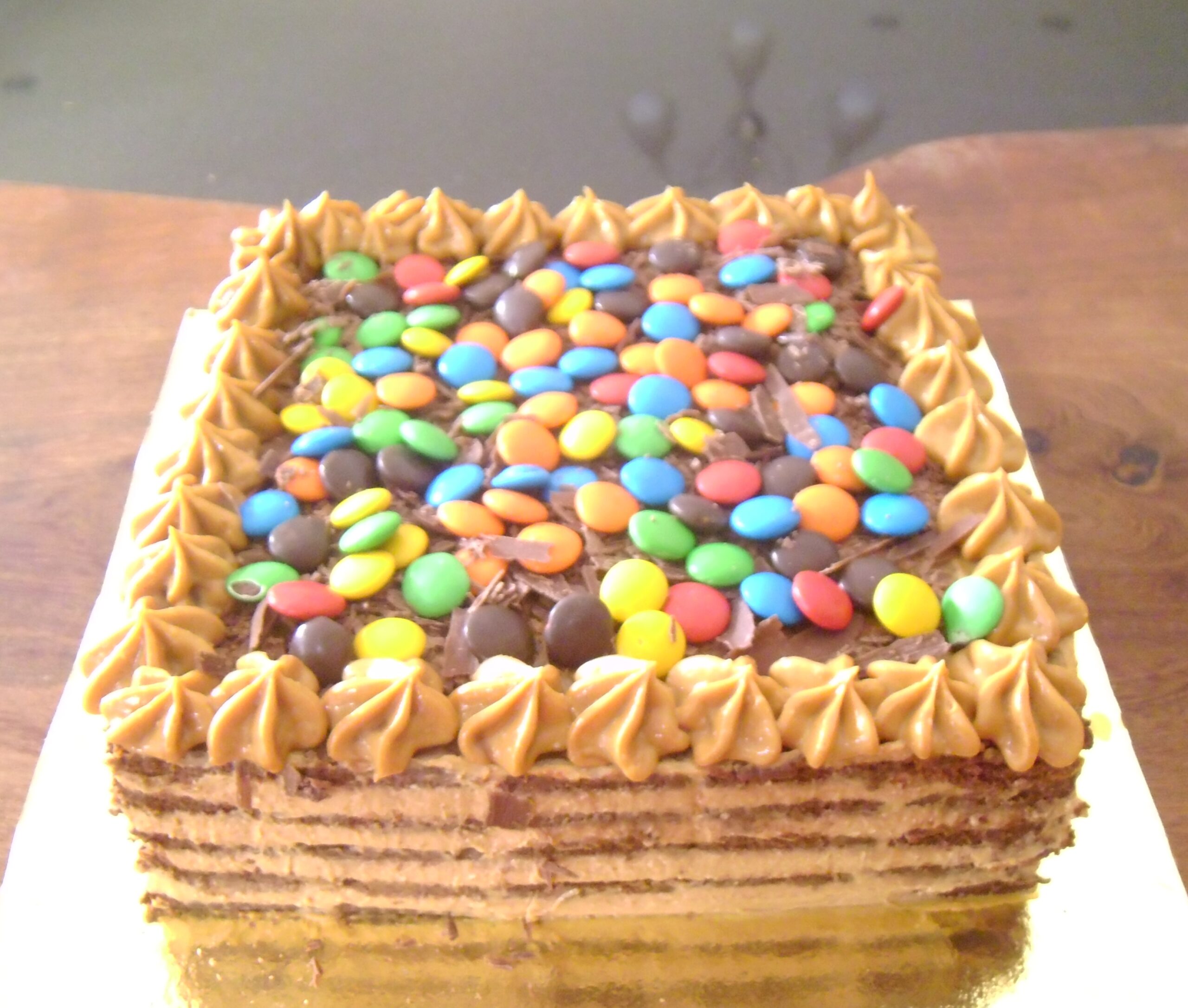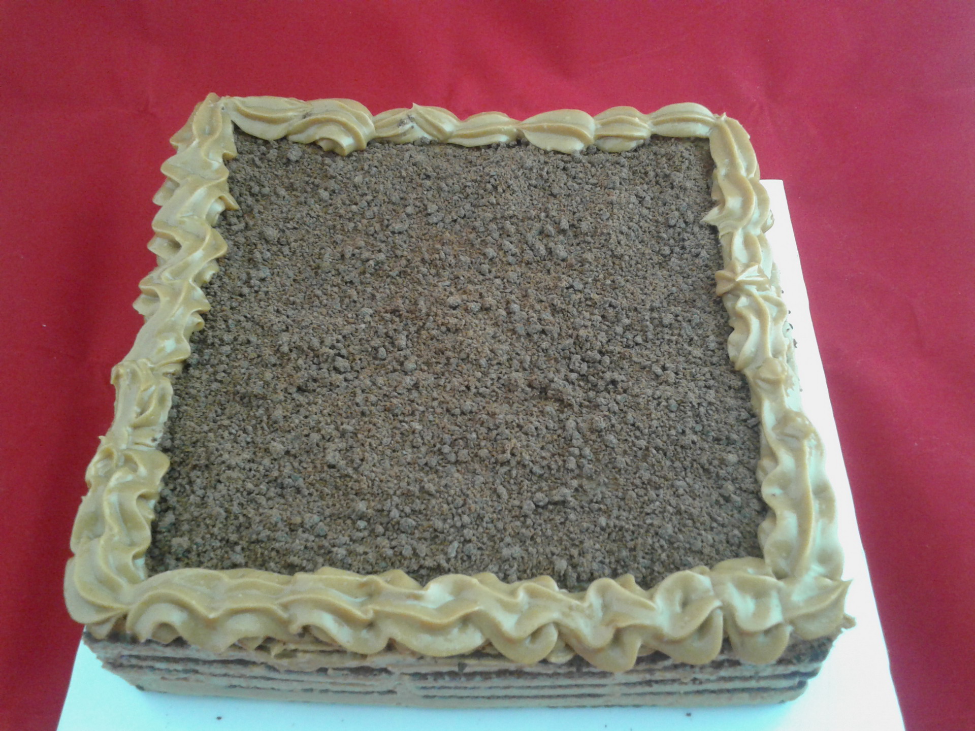 Torta de Chocolinas con cream cheese de dulce de leche. Su tamaño es de 20cm x 20cm. Rinde de 10 a 15 porciones.